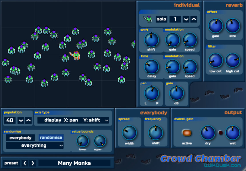 Crowd Chamber is an audio plug-in that layers multiple variations of a signal to create a crowd simulation. Up to almost 2,000,000 layers can be produced enabling simple chorusing effects, small crowds and stadiums, on to impossible situations and effects.
